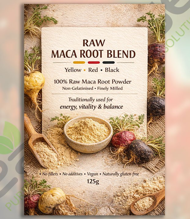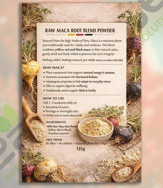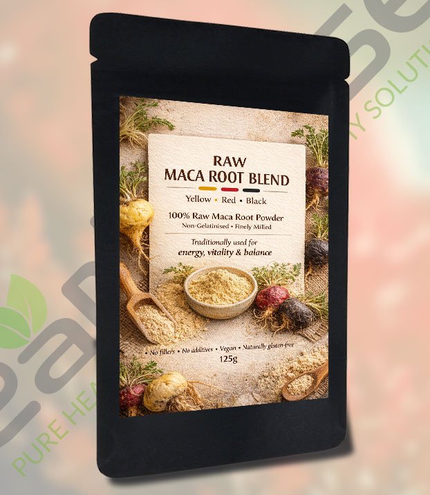 Our Organic Raw Maca Blend combines yellow, red, and black maca root in a balanced formula traditionally used to support natural energy, stamina, and hormonal wellbeing. Raw maca is gently milled to preserve its nutrients, making it a powerful daily superfood for both men and women.